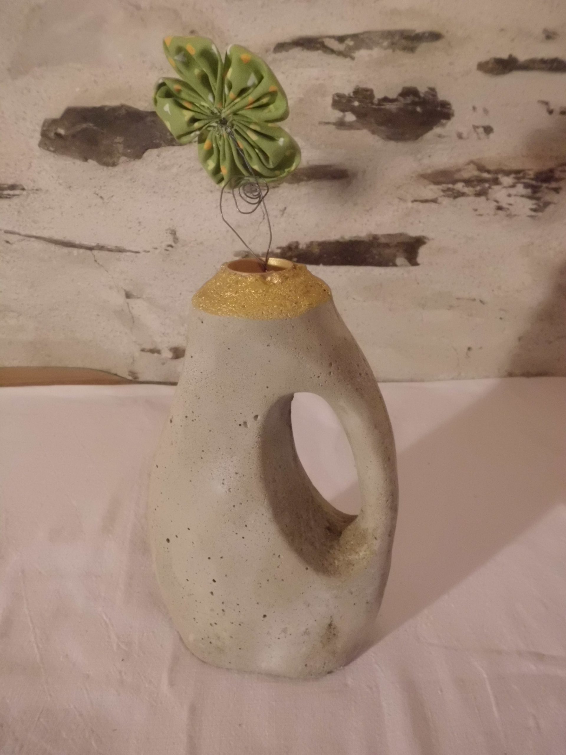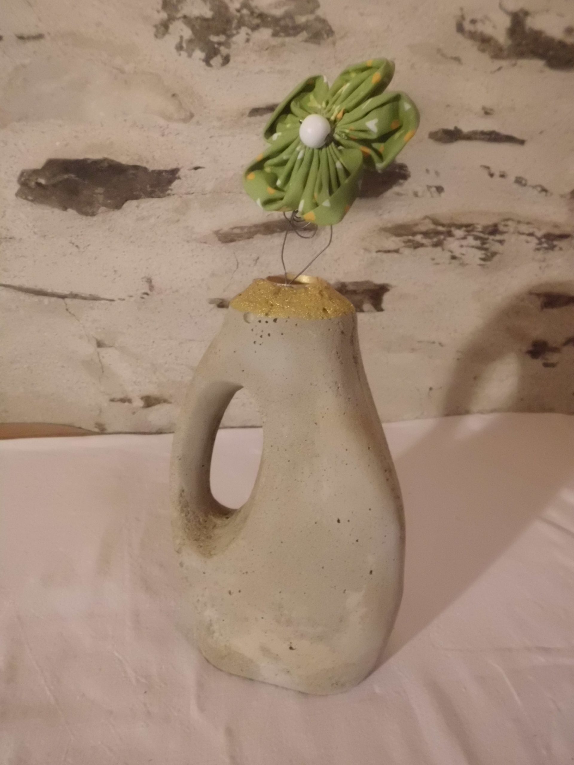 alte Waschmittelflasche mit Beton ausgegossen und mit Goldspray und Klarlack behandelt