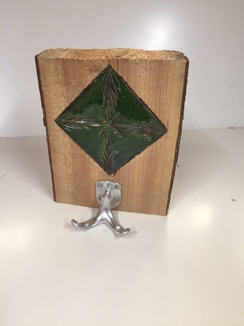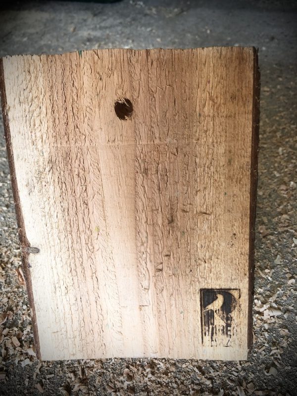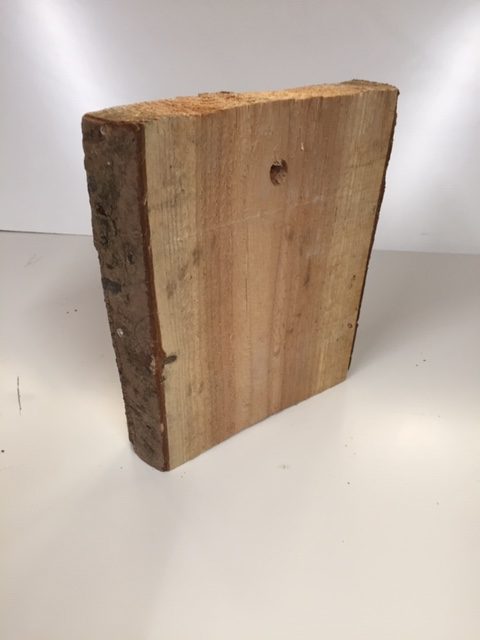 Lärchenbrett mit Baumkante und eingearbeiteter Fliese.