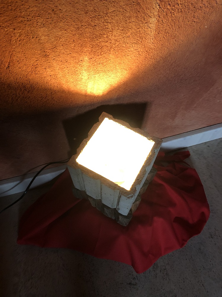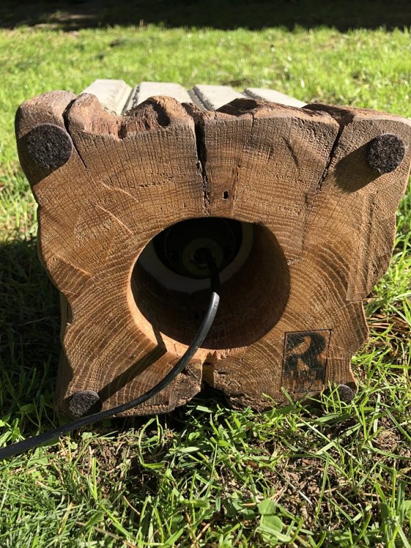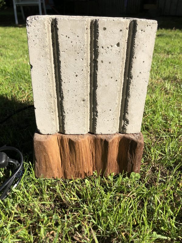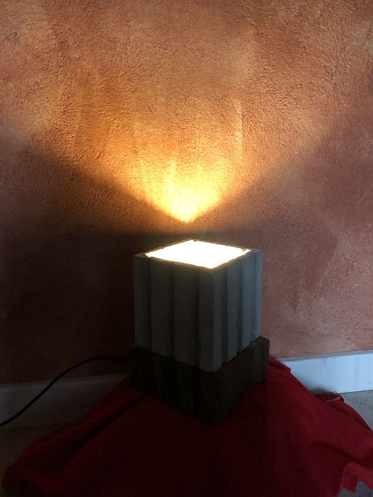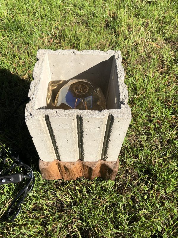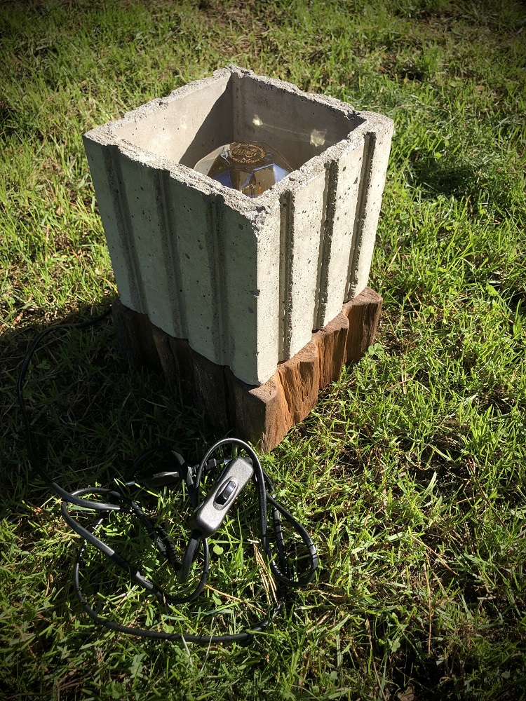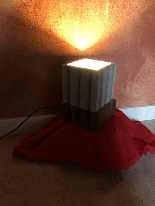 Lampenschirm aus Beton gefertigt. Lampenfuß aus Eichenholz gefertigt.