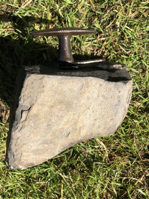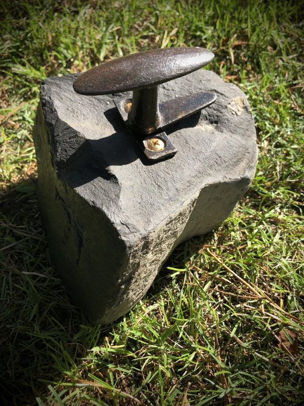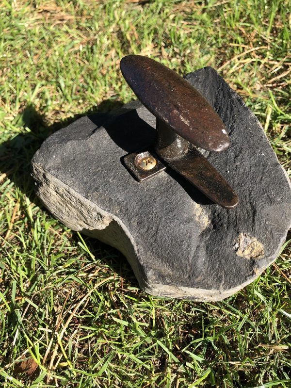 Türstopper aus Grauwacke gefertigt, mit altem Fenstergriff.
