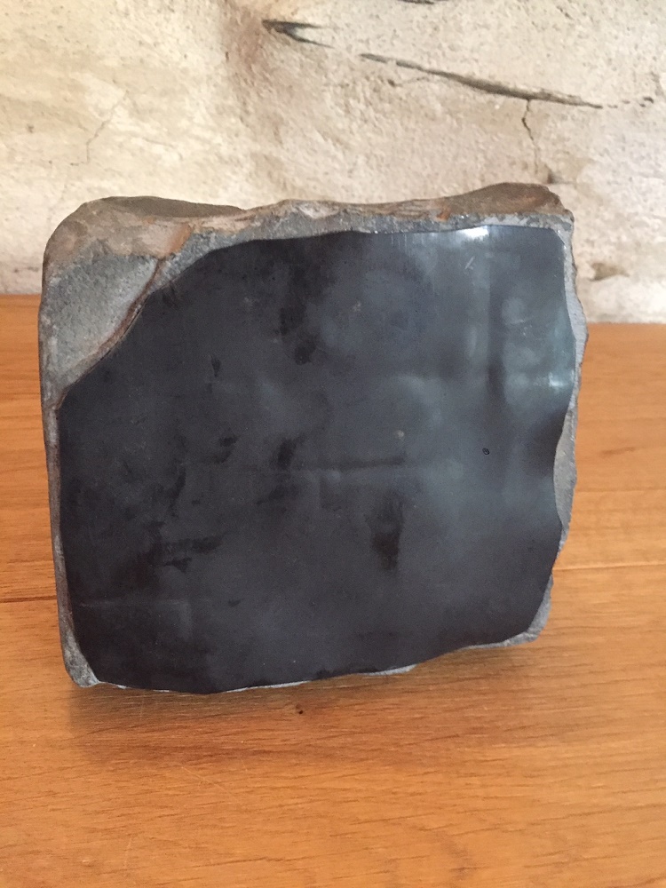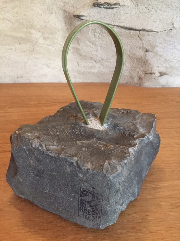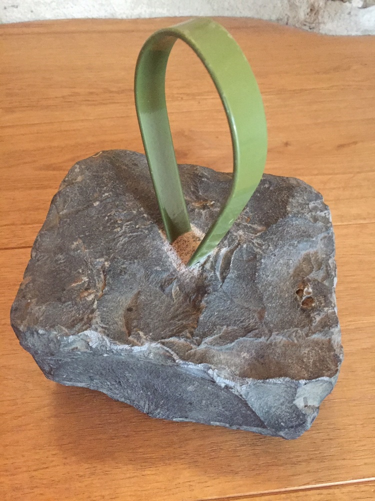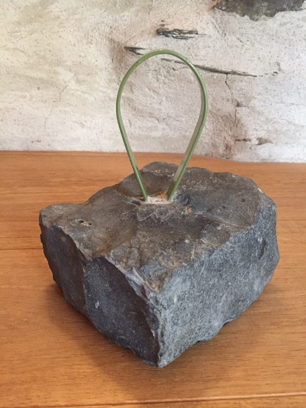 Aus Grauwacke mit einbetoniertem alten Lampengriff (Metall, grün) ca. 6 kg schwer.