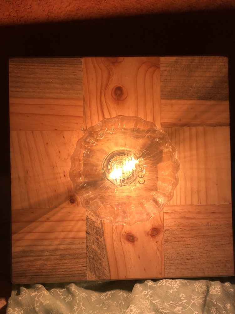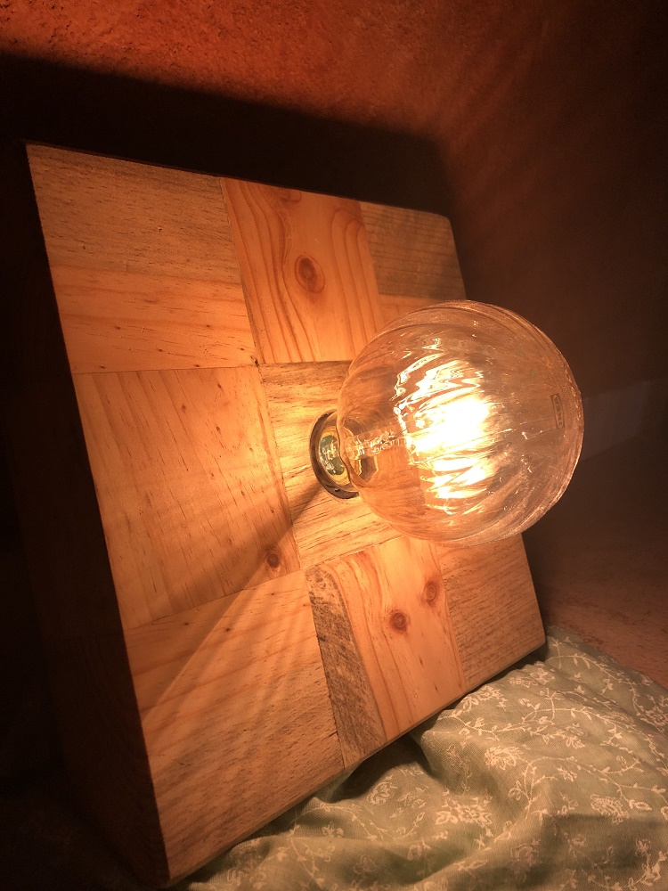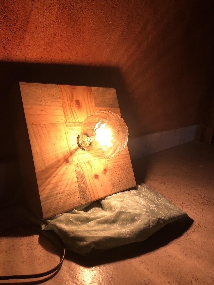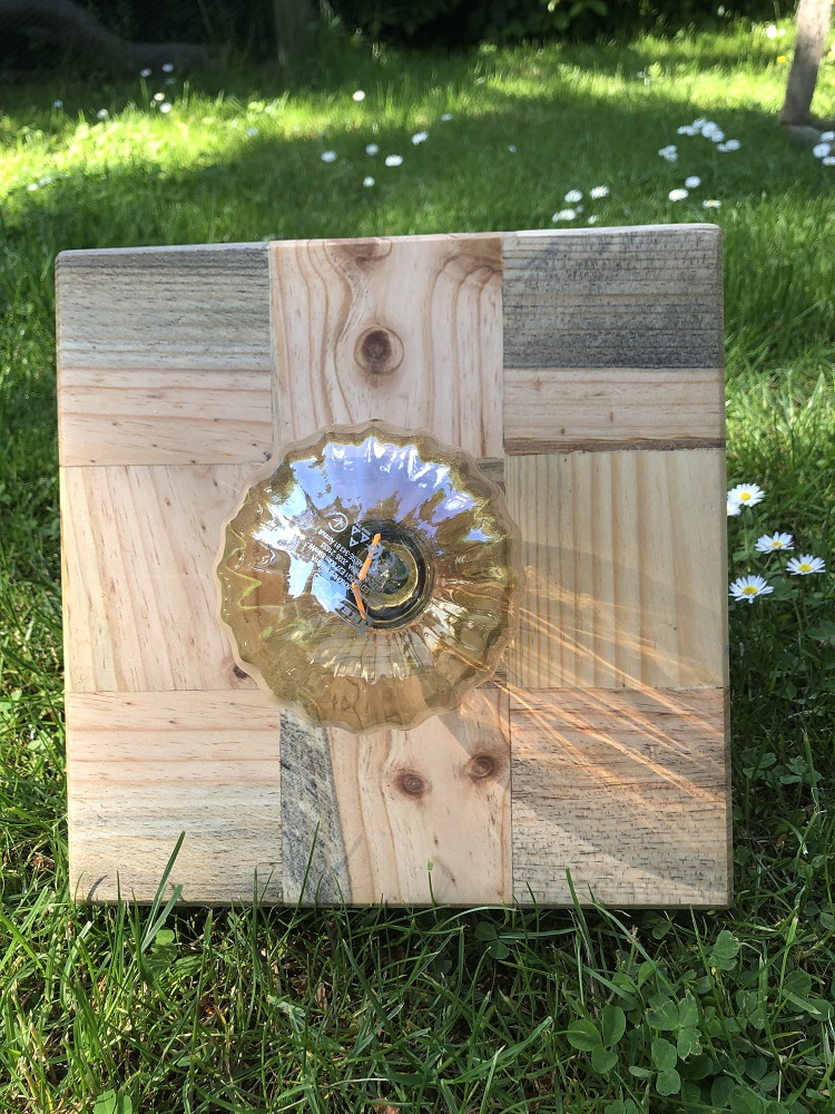 Holzplatte aus Klötzen von Einwegpaletten, mit Hardwachsöl behandelt.