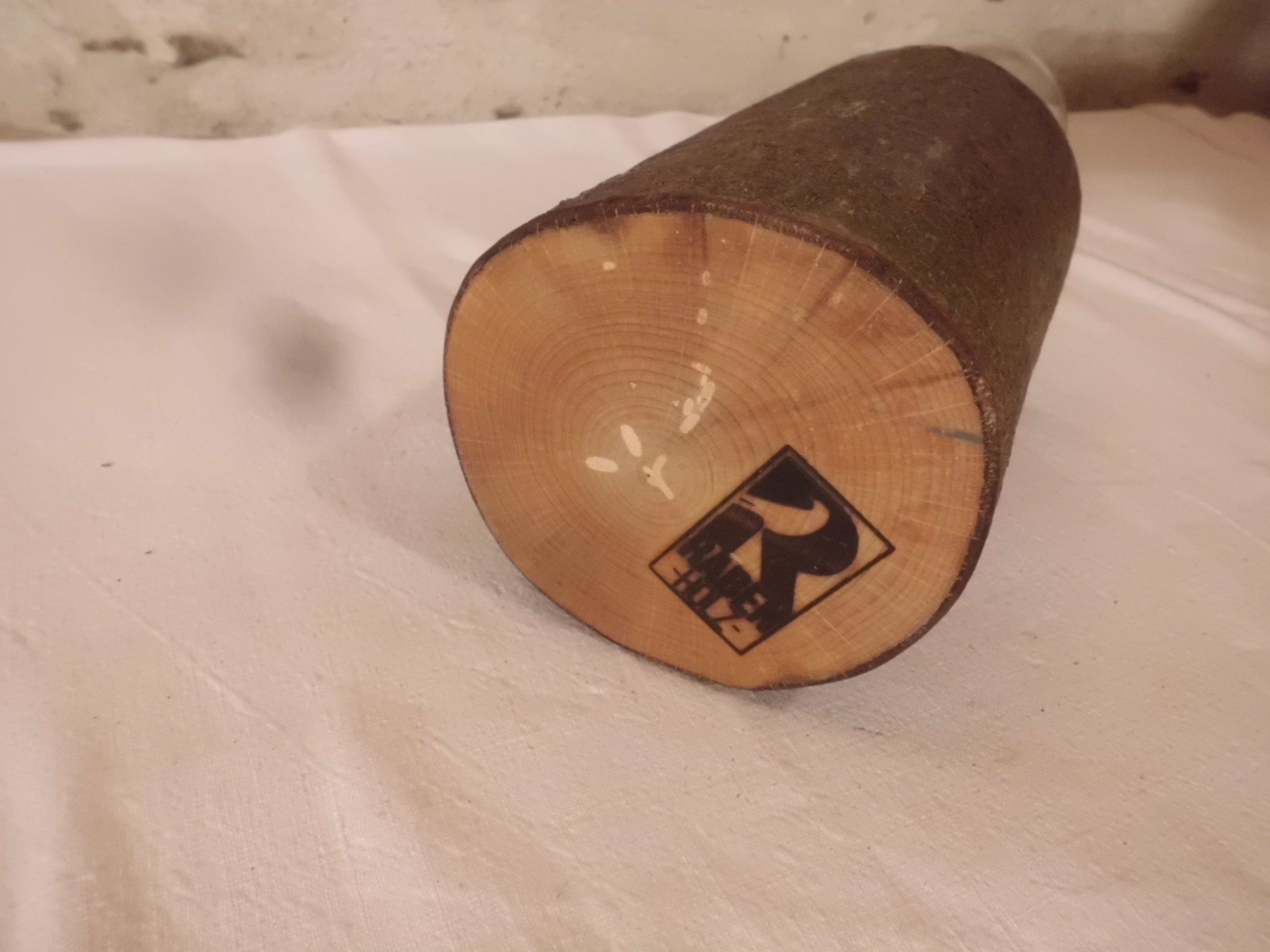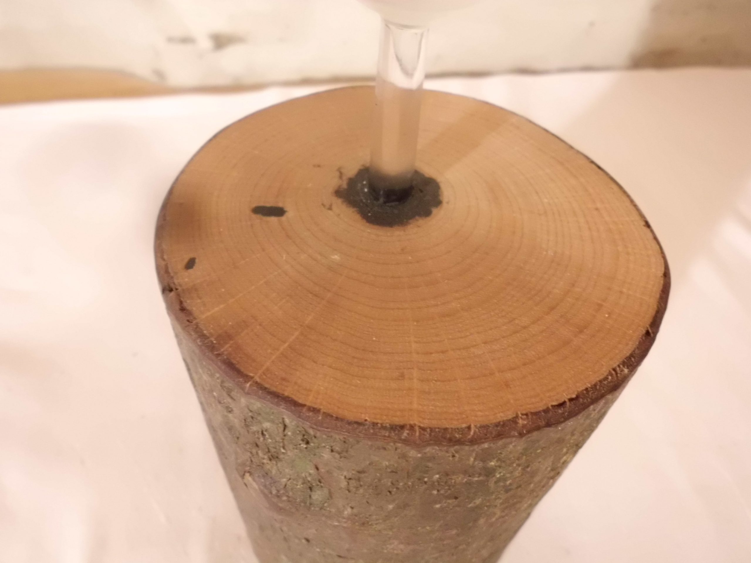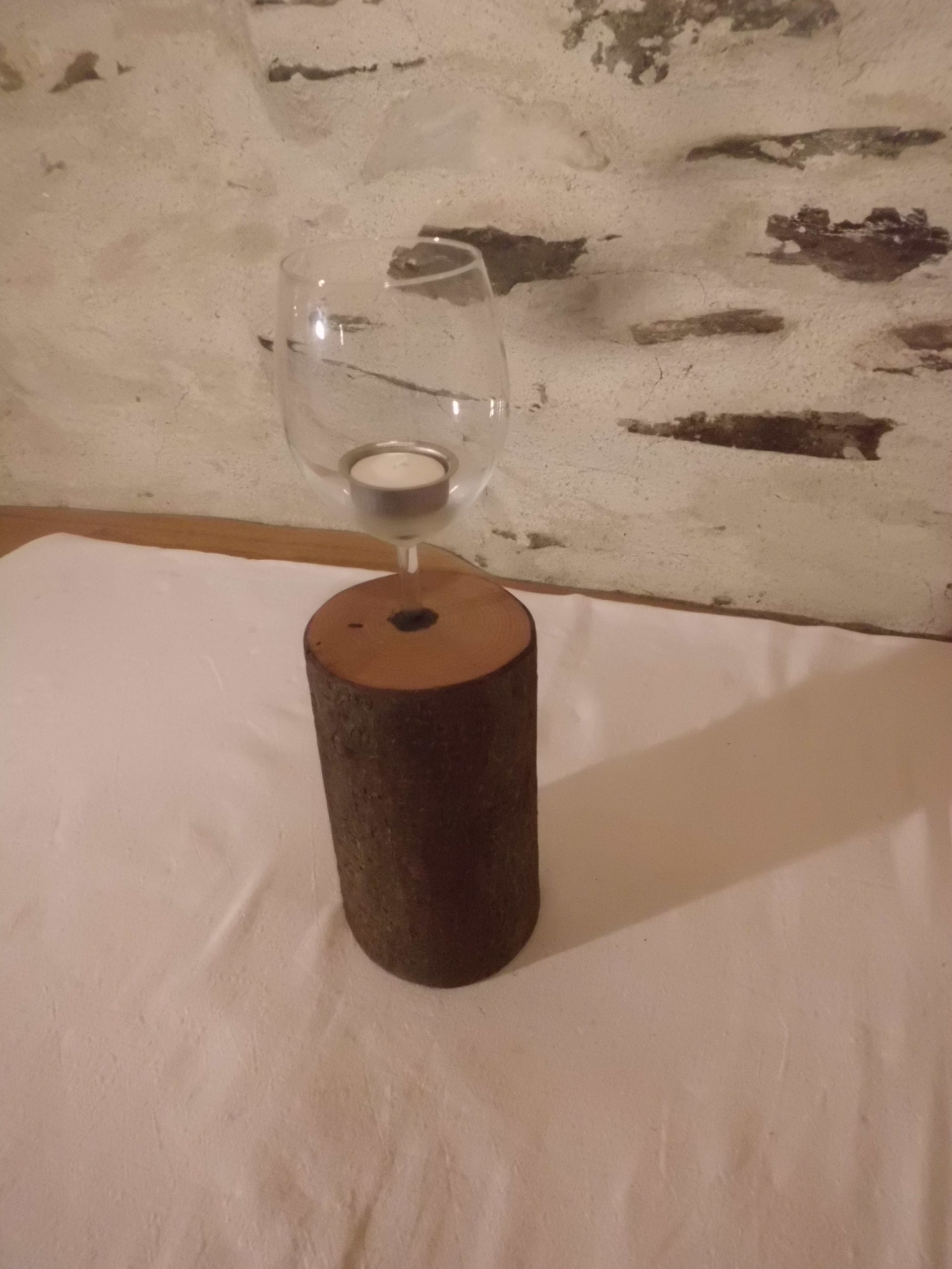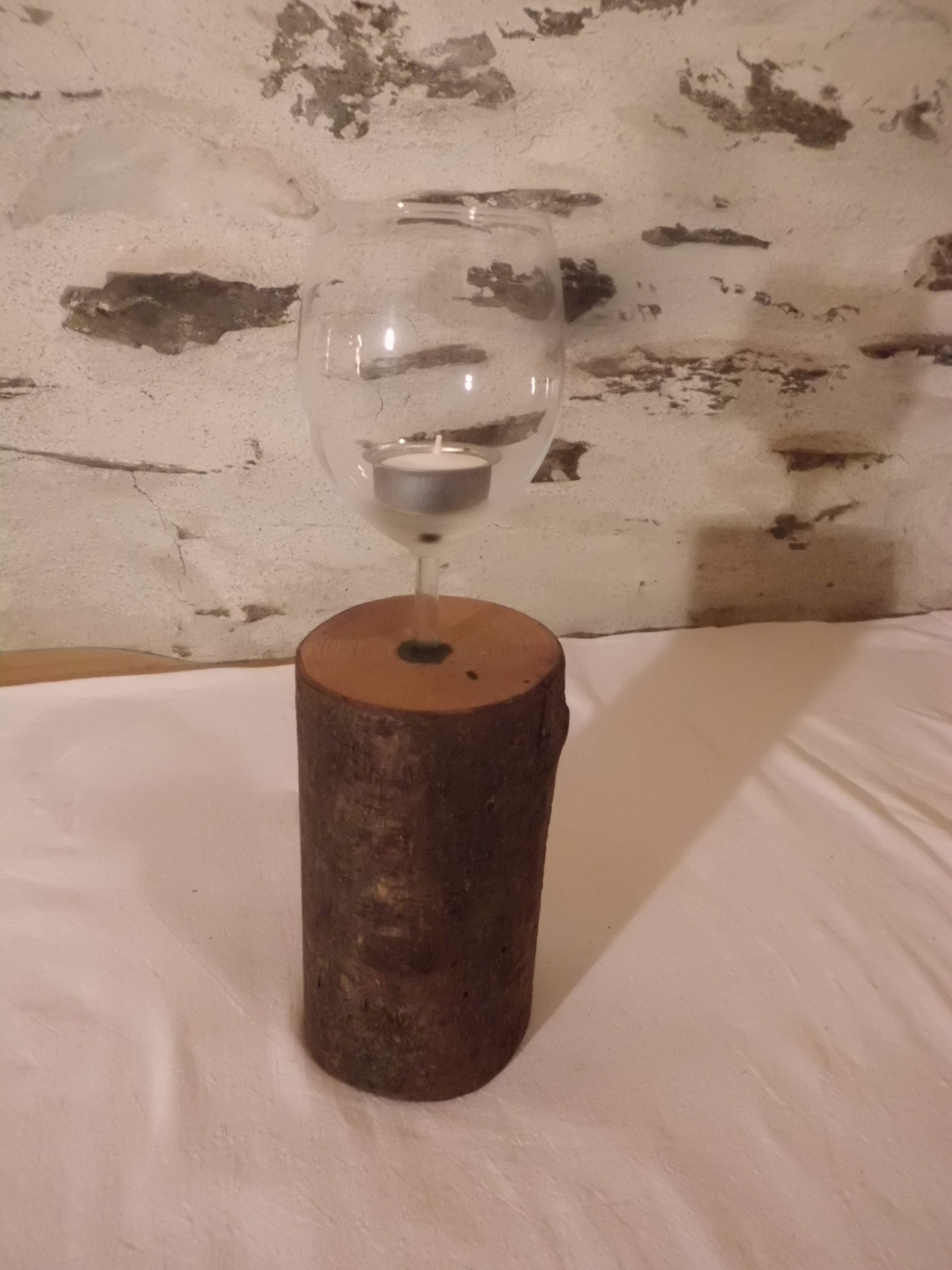 aus Aststück und alten Weinglas gefertigt und mit Leinölfirnis behandelt
